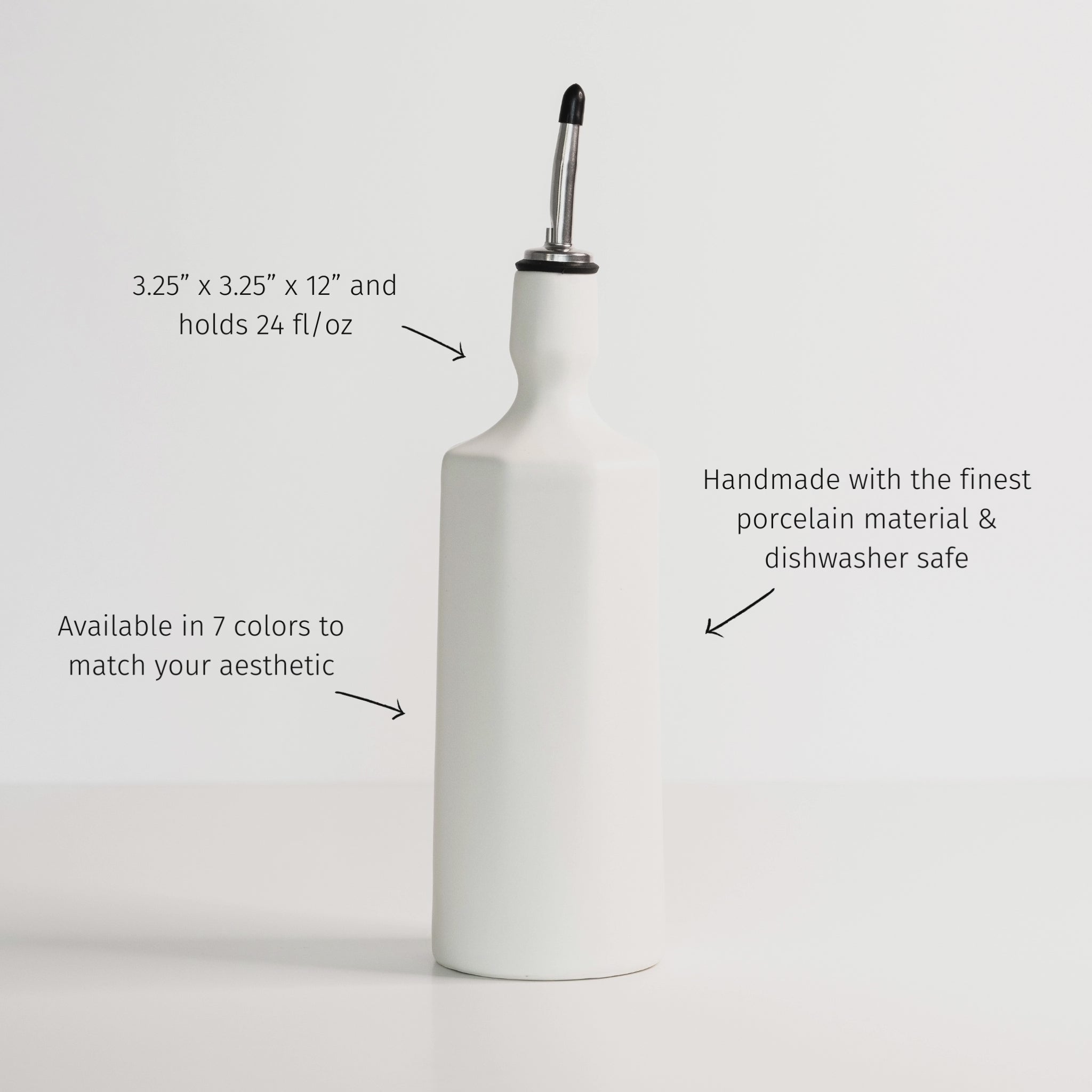 Material and Processes –Our Ceramic Elixir Olive Oil Bottle Dispenser is made from all natural porcelain, covered in a satin smooth glaze, that is durable and a joy to hold.
